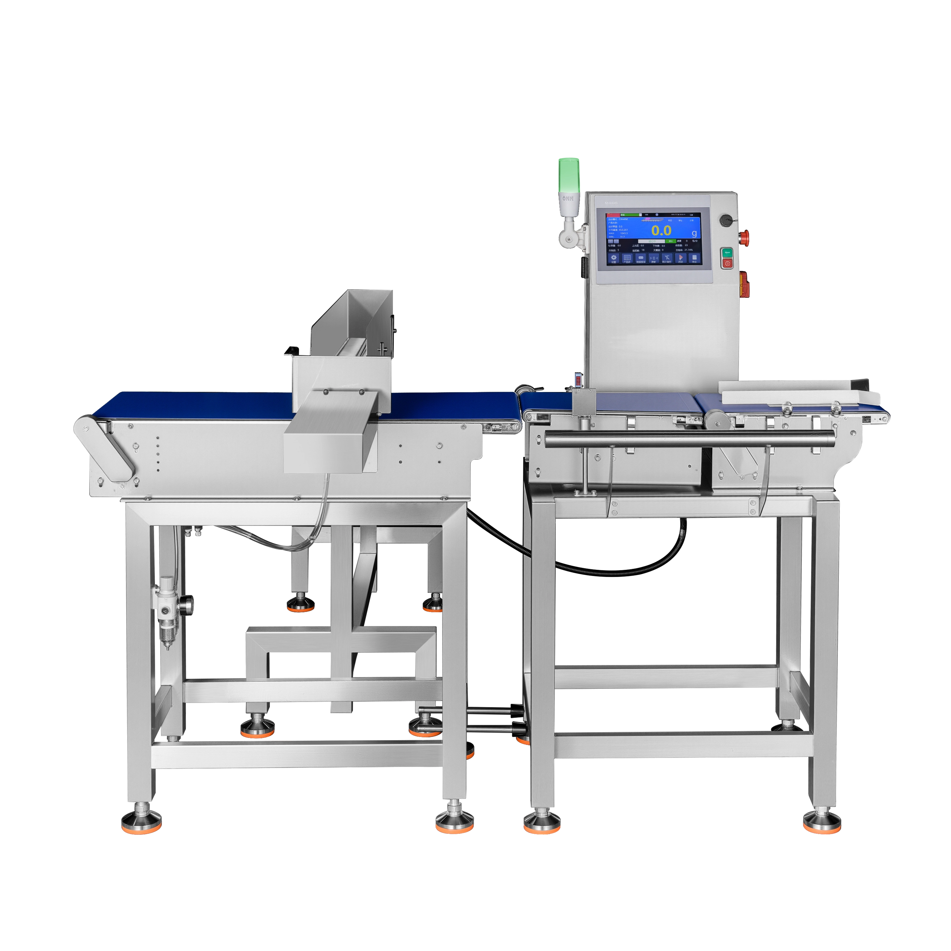 Verificador de peso é uma solução de pesagem em linha projetada para inspecionar automaticamente o peso do produto enquanto os itens se movem em uma esteira transportadora. Ao comparar o peso real de cada produto com valores-alvo e tolerâncias predefinidos, o controlador de peso identifica produtos com peso inferior e superior em tempo real e os remove do fluxo de produção sem interromper a velocidade da linha. Usado para a detecção de produtos com excesso ou falta de enchimento, como itens engarrafados, enlatados e embalados em barris, em indústrias como alimentos, produtos farmacêuticos, produtos de saúde, produtos químicos, plásticos, eletrônicos, etc.