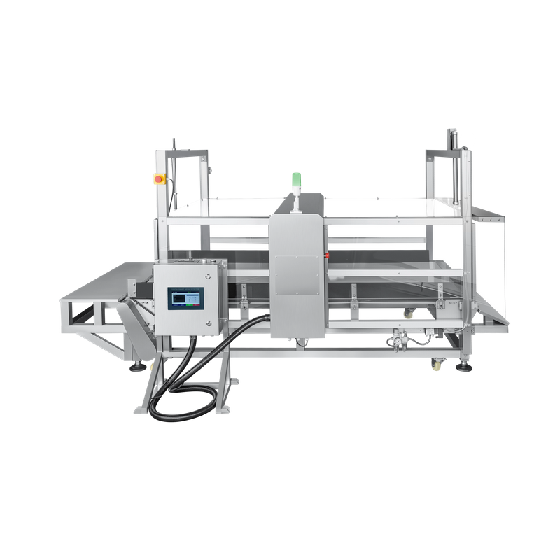 Uma placa interceptadora na saída cai automaticamente quando o metal é detectado para rejeitar produtos defeituosos.
